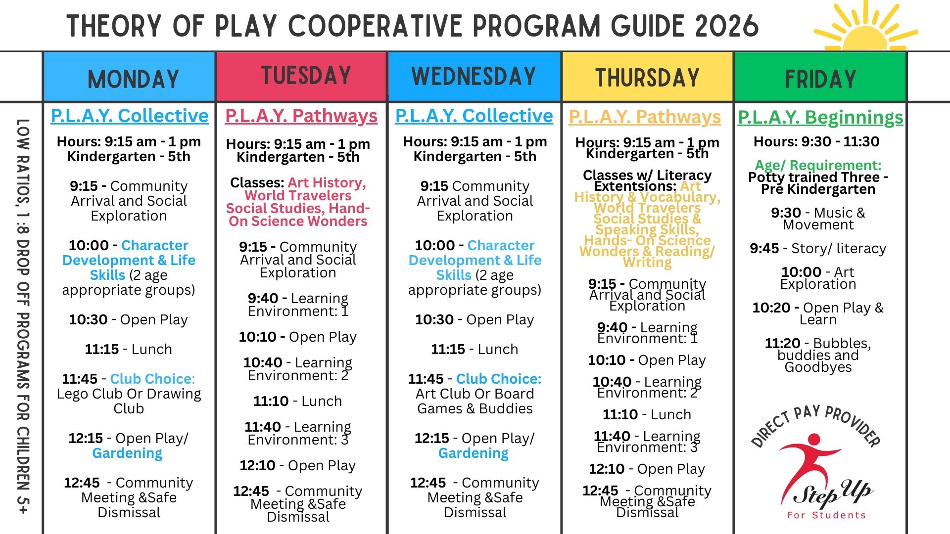 To ensure the best fit for each child and family, tours and trial days are required as part of the admissions process. Tours provide an opportunity for parents and guardians to explore our learning environments, meet our teachers, and experience the P.L.A.Y. Cooperative philosophy firsthand. Trial days allow children to engage in our play-centered, hands-on lessons, giving them a chance to feel comfortable, curious, and confident in our classrooms. This process helps families make an informed decision and ensures that every student is set up for a successful and enriching experience.